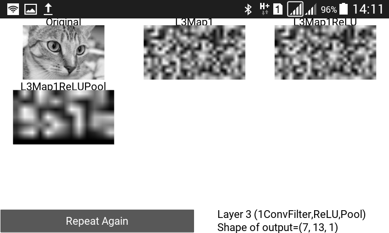 The app is designed to work on each three successive conv-relu-pool layers, show their outputs, return so that the user can execute the next three layers by clicking a button at the bottom of the screen. The previous result before clicking the button will be used for further processing.