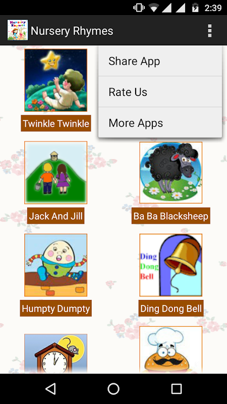 NURSERY RHYMES is a perfect app for your kids. It has various English Nursery Rhymes along with images and audio. Currently it has over 60 rhymes. The interface is very simple keeping in mind that the app would be used by Kids.