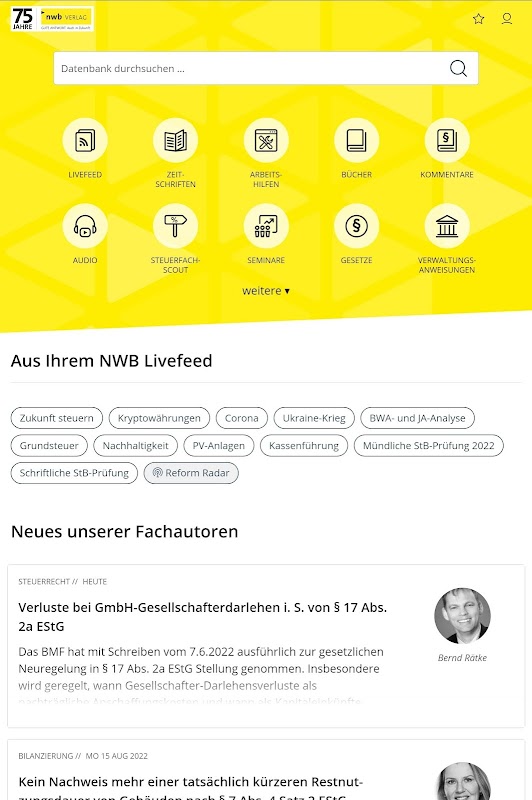 ต้องขอบคุณแอปนี้ที่ทำให้คุณสามารถใช้ฐานข้อมูล NWB ของคุณได้อย่างสะดวกสบาย พร้อมด้วยบทความเฉพาะทางที่เป็นประโยชน์จากนิตยสาร NWB อุปกรณ์ช่วยในการทำงาน กฎหมาย และความคิดเห็น