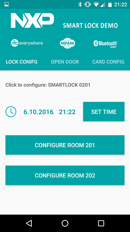 APP สาธิต NXP SmartLock สำหรับ OM27462NBR Kit ใช้บลูทู ธ หรือเอ็นเอฟซีที่จะเปิดประตู