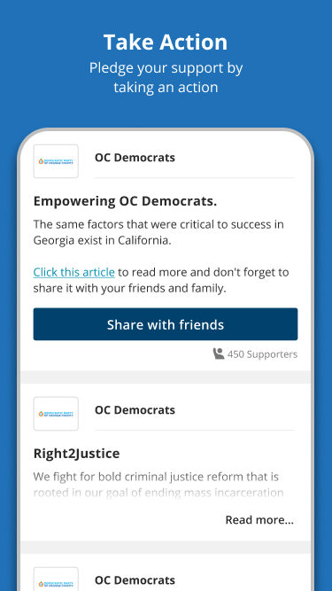 แอปพลิเคชันแบบครบวงจรสำหรับการเคลื่อนไหวเพื่อประชาธิปไตยในออเรนจ์เคาน์ตี้ แคลิฟอร์เนีย! เราจัดเตรียมทุกอย่างให้คุณตั้งแต่รายชื่อผู้สมัครรับเลือกตั้งจากพรรคประชาธิปัตย์ (จากบนลงล่างของบัตรลงคะแนน) รวมถึงกิจกรรมประชาธิปไตยในท้องถิ่น วิธีเชื่อมต่อกับเพื่อนบ้านในระบอบประชาธิปไตยของคุณ และอีกมากมาย