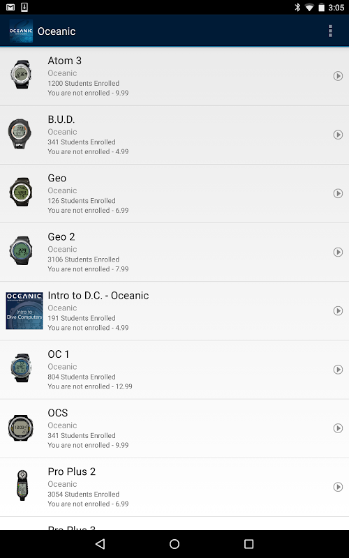 Oceanic Dive Computers allows users to view their Oceanic (and Aeris) scuba diving computer in action on their mobile device. It provides a way to thoroughly learn the operation of a dive computer in an exciting and interactive way. In addition to its class setting, Oceanic Dive Computers is also a mobile reference if something is forgotten while on the go.