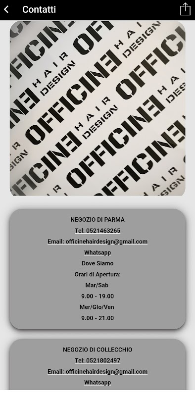 Officine Hair Design ตั้งอยู่ใน Parma และ Collecchio และมีร้านทำผม 2 แห่ง