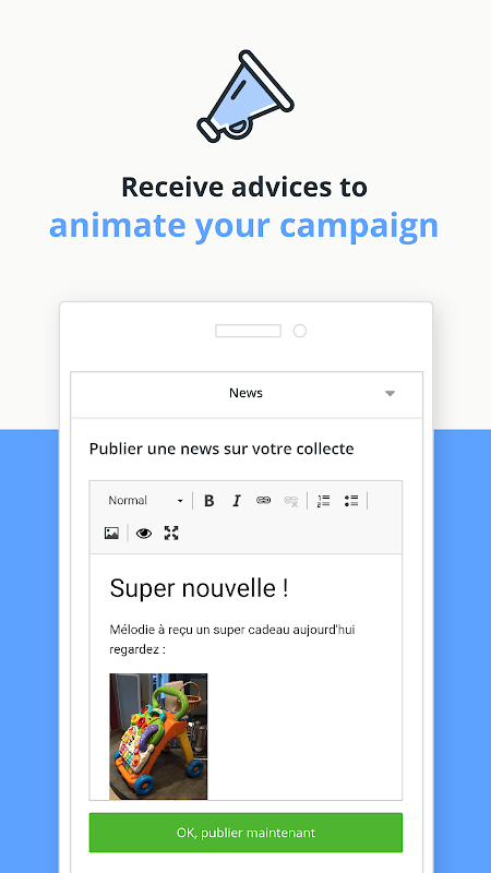 Recevez des notifications pour chaque nouvelle contribution et des conseils pour animer votre collecte.