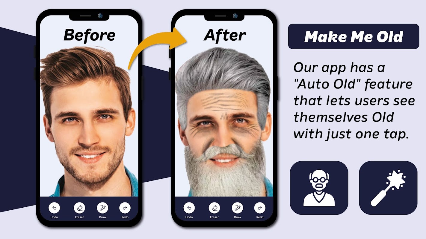 สงสัยว่าคุณจะมีลักษณะเหมือนชายชราอย่างไร? ไม่จำเป็นต้องทำอีกต่อไป! แอพ Age Face เป็นเครื่องบูธริ้วรอยบนใบหน้าโดยทั่วไปโดยใช้แอพอายุน้อยถึงเก่า เพียงเพิ่มรูปภาพ (จากแกลเลอรี่หรือกล้อง) และดูใบหน้าของชายชราของคุณโดยใช้ Make Me Old Face changer หากคุณสงสัยว่าคุณดูเป็นอย่างไรในวัยชรา โปรดดาวน์โหลดแอปเปลี่ยนอายุนี้ เครื่องมือสร้างหน้าเก่านี้จะช่วยให้คุณรู้ว่าคุณดูเป็นอย่างไรในวัยชราโดยใช้แอป Future Face จากเด็กไปจนถึงแอปหน้าเด็กถึงแก่จริงโดยใช้แอปหน้าอายุ ด้วยการใช้ child to old face changer คุณสามารถทำให้ตัวเองและเพื่อนของคุณแก่ได้ด้วยการคลิกเพียงครั้งเดียวโดยใช้แอป Face changer