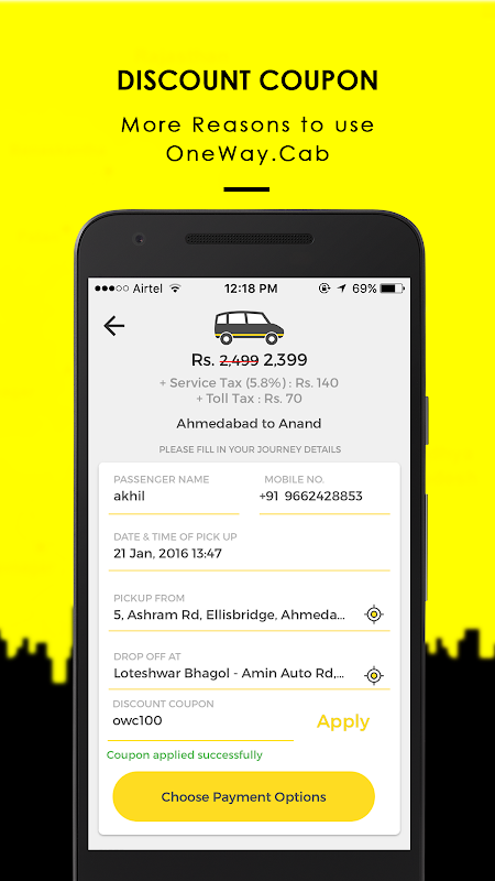 จองรถแท็กซี่ของคุณในขั้นตอนง่ายๆโดยใช้แอป OneWayCab: 1. เลือกเมืองที่คุณเลือก, เมืองปลายทาง, ประเภทรถ
