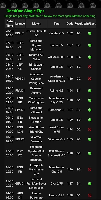 แม้ว่าการเดิมพันแบบสะสมอาจทำให้คุณได้รับผลตอบแทนที่ดี การเดิมพันดังกล่าวเป็นอันตรายโดยกำเนิด ซึ่งทำให้ผู้ชื่นชอบฟุตบอลหลายคนหลีกเลี่ยงสิ่งเหล่านี้ ในทางกลับกัน การเดิมพันเดี่ยวนั้นมีเปอร์เซ็นต์การชนะที่สูงกว่ามาก แต่ในขณะเดียวกัน ผลตอบแทนที่คุณอาจได้รับอาจไม่น่าประทับใจนัก อย่างไรก็ตาม One4One Single Tip ให้เดิมพันขั้นต่ำที่ 1.80 และมีอัตราการชนะที่สูงกว่า