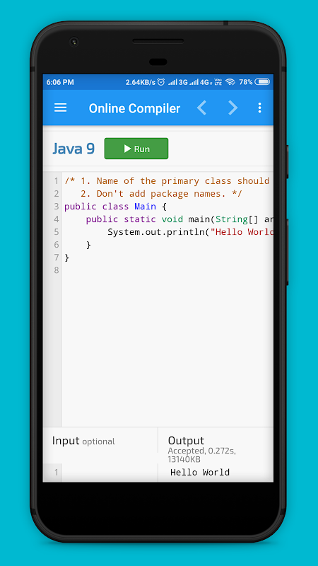 Online Compiler is a compiler and IDE to compile and run code snippets and programs on your android phone for over 20+ Programming Languages.