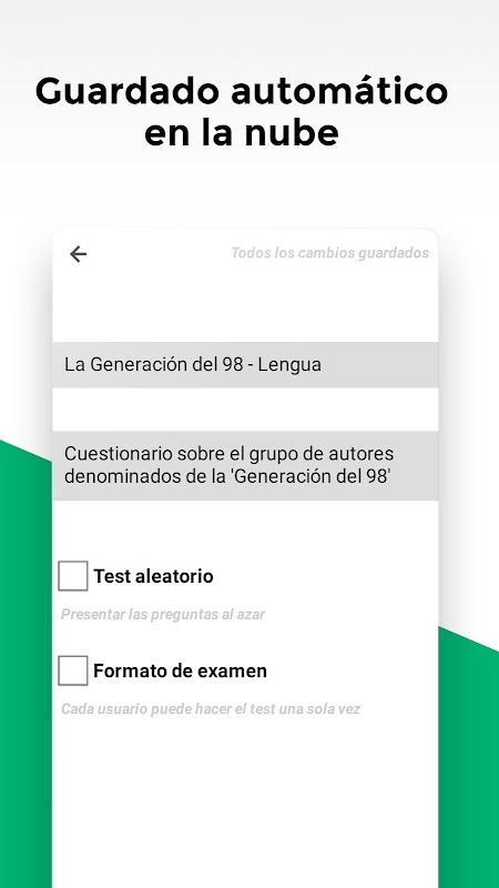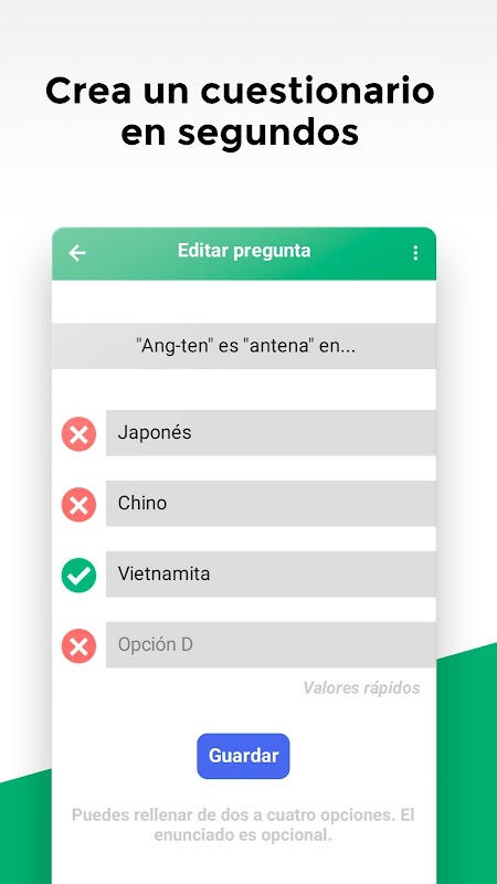 Haz cuestionarios a tu gusto: Escribe y edita tus propias preguntas tipo test con dos, tres o cuatro opciones de respuesta.