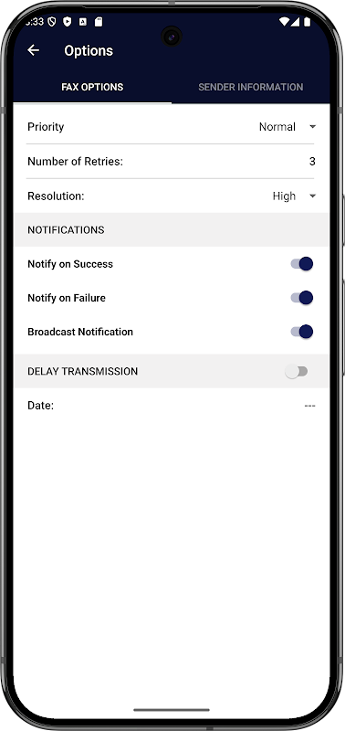 • กำหนดค่าตัวเลือกแฟกซ์ (ลำดับความสำคัญ ความละเอียด ลองใหม่) และกำหนดเวลาการส่งแฟกซ์ล่าช้า