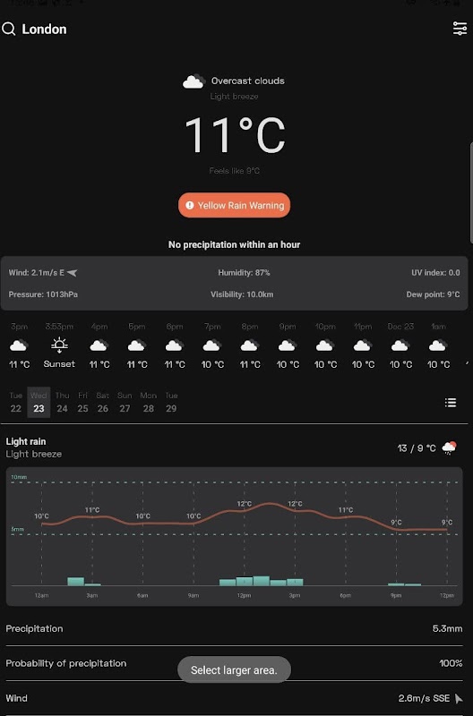 5. ขยายวันใดก็ได้ในสัปดาห์และรับแผนภูมิภาพเกี่ยวกับอุณหภูมิและข้อมูลสภาพอากาศโดยละเอียดสำหรับวันนั้นรวมทั้งเวลาพระอาทิตย์ตก / พระอาทิตย์ขึ้น 2 วันแรกมาพร้อมกับแผนภูมิความผันผวนของอุณหภูมิรายชั่วโมง