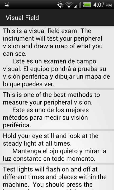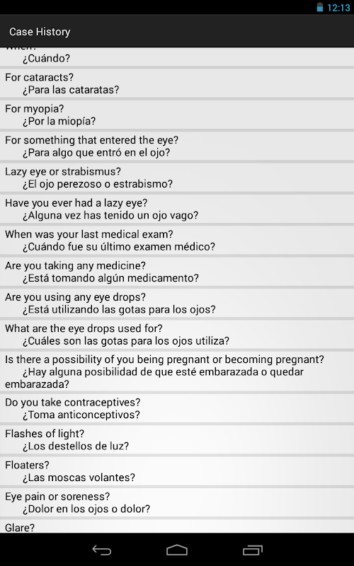 ทัศนมาตรศาสตร์นักแปลภาษาสเปนสำหรับ Android เป็นนักแปลมืออาชีพมือถือสำหรับผู้ปฏิบัติงานเช่นออพจักษุแพทย์, แพทย์, ช่าง Optometric และผู้ให้บริการด้านสุขภาพอื่น ๆ นี้เป็นเพียงวิธีการที่เร็วที่สุดในการสื่อสารกับผู้ป่วยที่พูดภาษาสเปนในการสอบตา วลีที่มีการแบ่งออกเป็นประเภทที่ใช้งานง่ายสำหรับการเข้าถึงที่รวดเร็วในการวลีที่ถูกต้องในเวลาที่เหมาะสม บันทึกที่มีคุณภาพสูงของทุกคำแนะนำทางคลินิกที่จำเป็นพื้นฐานในขณะนี้ที่ปลายนิ้วของคุณไว้ในที่เดียว