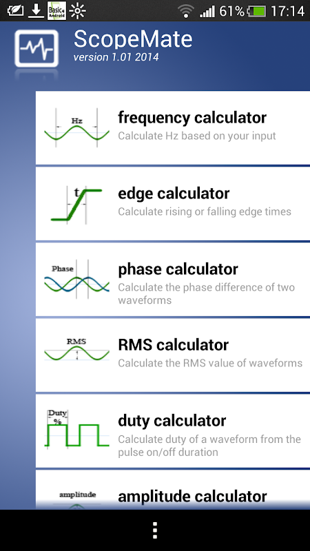 - Amplitude Calculator based upon voltage, number of divides and probe attenuation.