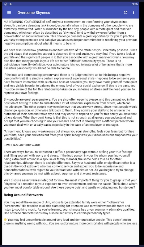 Embark on this journey of transforming your shyness into strength. Fear of failure is a natural and perfectly normal response for all of us when we venture into new territory. You have made a decision and choice to change your life for the better and you will succeed. You are not aiming for perfection here. The only thing required of you for success is a willingness to try. If you have a setback or disappointment, great! You’ve now joined the rest of the world. Keep in mind that every difficult situation you encounter is an opportunity for growth and greater self-awareness. And now you have chosen to look at your life in a hopeful, optimistic way.