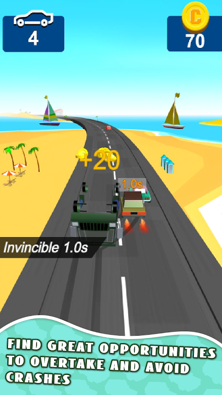 ต้องมีสมาธิและตอบสนองอย่างรวดเร็ว—กดค้างไว้เพื่อเปลี่ยนเลน จับเวลาการเคลื่อนไหวอย่างแม่นยำ และปล่อยเพื่อกลับสู่ความปลอดภัย ถนนเต็มไปด้วยความท้าทาย และมีเพียงนักขับที่ดีที่สุดเท่านั้นที่จะเชี่ยวชาญศิลปะแห่งการแซงได้