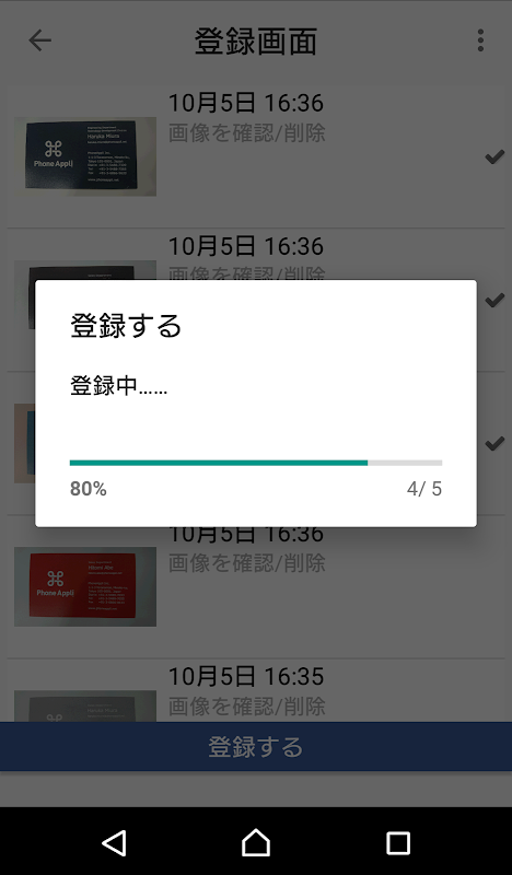 お客様からいただいた名刺をスマートフォンカメラで撮影し、アプリ内の登録ボタンを押すだけで、Web電話帳の共有電話帳、個人電話帳へ名刺登録が可能です。