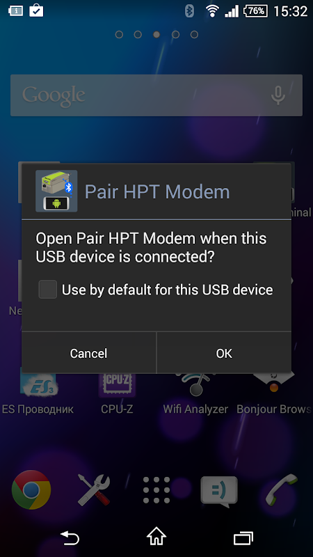 The application is designed to pair or unpair JAVAD HPTxxxBT Bluetooth radios with JAVAD GNSS receivers like TRIUMPH-2 or TRIUMPH-1. After installation just connect modem with cable to microUSB connector of your Android device (standard USB-to-microUSB cable is required) runs the application. Receiver is connected with Bluetooth or WiFi.