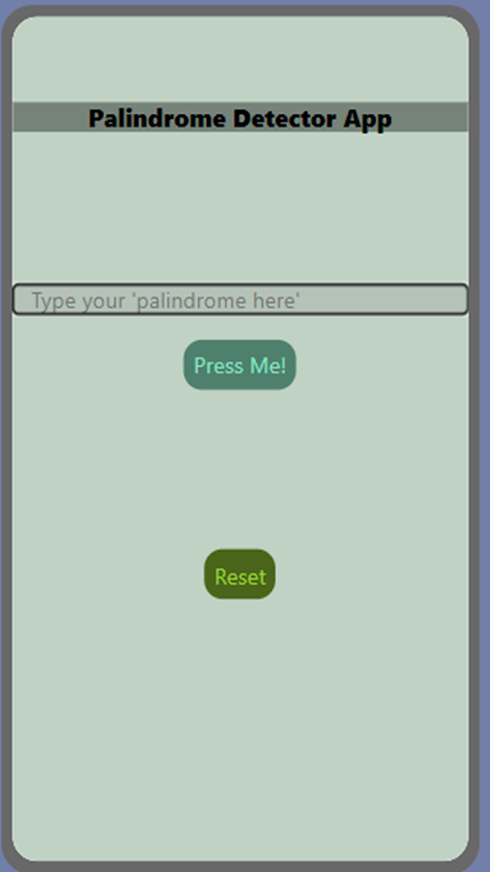 Just type your text in the input and press the button - 'Press Me!'. You will get to know if your text is a palindrome or not.
