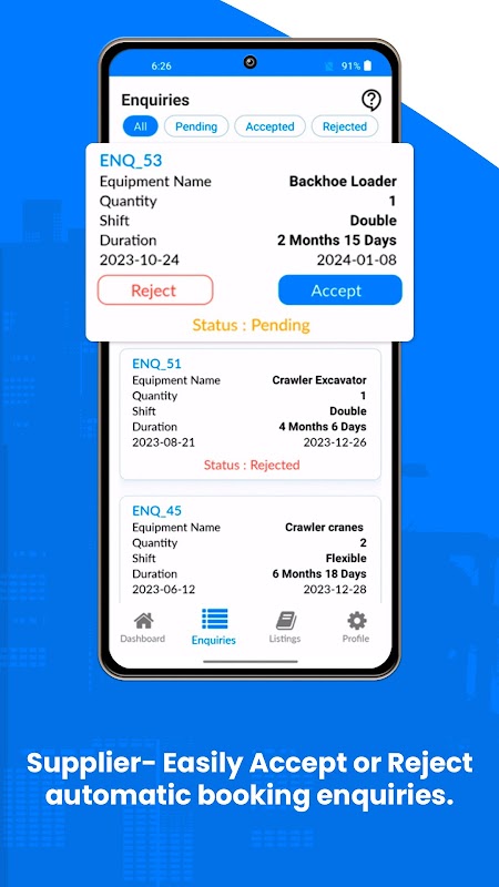 บริการให้เช่าอุปกรณ์หนักแบบครบวงจรที่ซัพพลายเออร์สามารถลงรายการอุปกรณ์ไม่จำกัดจำนวนและเช่าให้กับผู้รับเหมา และผู้รับจ้างสามารถใช้แอพนี้เพื่อจ้างอุปกรณ์ได้ทุกที่ทุกเวลาและทุกขนาดโดยไม่ต้องวุ่นวายกับการโทรศัพท์ไม่จำกัด
