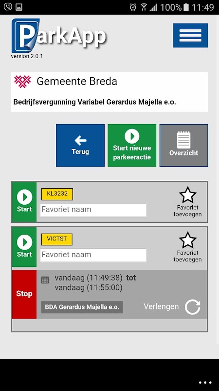 • Optioneel Verlengen: Alleen wanneer de gemeente of parkeerbedrijf het toestaat de parkeeractie te verlengen.