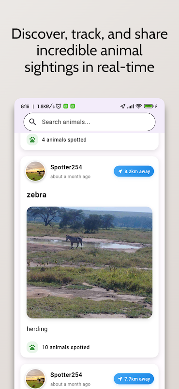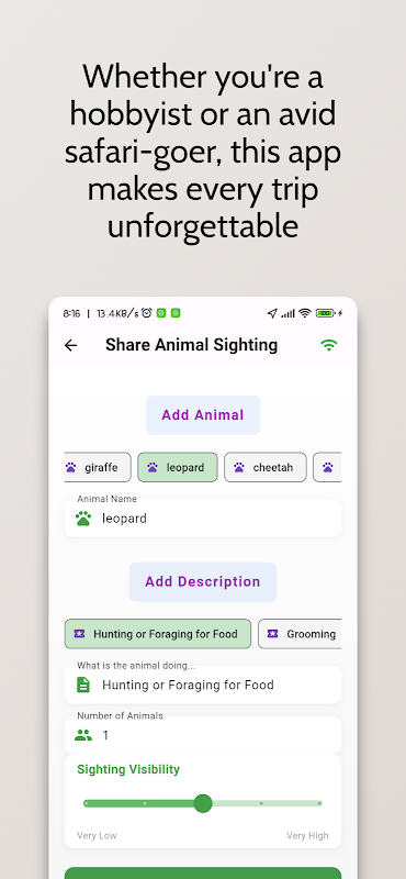 เริ่มต้นการผจญภัยที่น่าตื่นเต้นของสัตว์ป่าด้วยแอปที่เป็นนวัตกรรมใหม่ที่จะเปลี่ยนแปลงวิธีการสำรวจและสัมผัสกับธรรมชาติของคุณ ไม่ว่าคุณจะเป็นช่างภาพสัตว์ป่าผู้หลงใหล นักเดินป่าทั่วไป หรือผู้รักการอนุรักษ์ แอพของเราช่วยให้คุณค้นพบ บันทึก และแบ่งปันการพบเห็นสัตว์ที่น่าทึ่ง