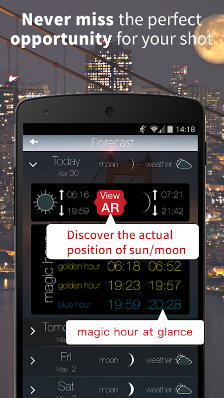 Landscape Photography made easy. Find the top photography locations and predict the position of the sun and moon.