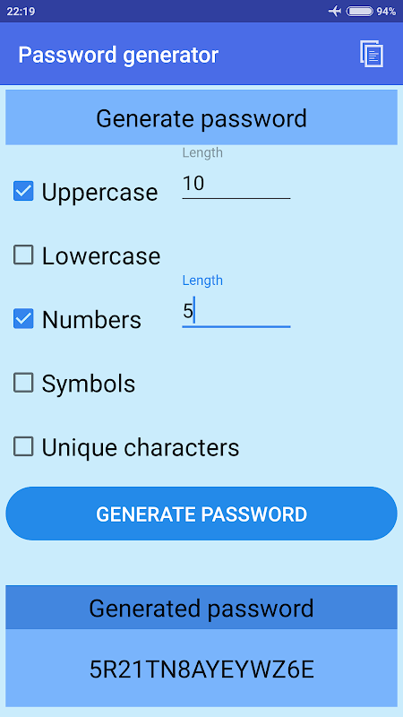 ด้วยแอปฟรีนี้ คุณสามารถสร้างรหัสผ่านที่คาดเดายากได้ คุณสามารถเลือกได้ว่าต้องการตัวพิมพ์ใหญ่ ตัวพิมพ์เล็ก ตัวเลข สัญลักษณ์ ความยาวของแต่ละรายการ และหากคุณต้องการให้รหัสผ่านมีอักขระที่ไม่ซ้ำกันหรือไม่