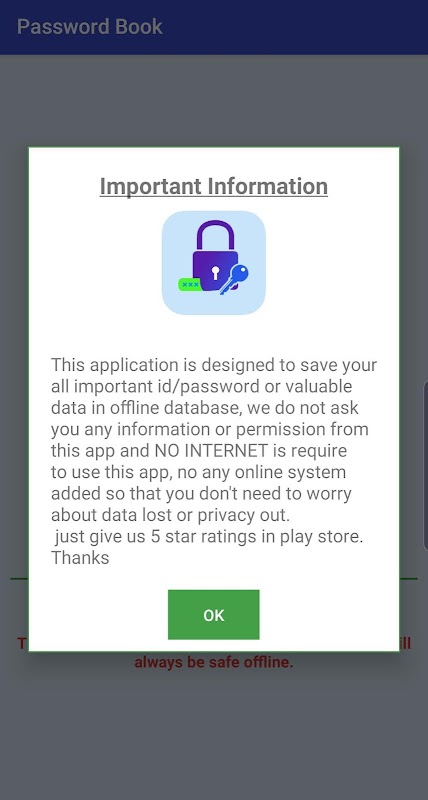 Well, we have designed this app only for offline mode which saves your input data inside the app with one MASTER PASSWORD. First of all you need to create a Master Password then you will be able to store and view your data at anytime.