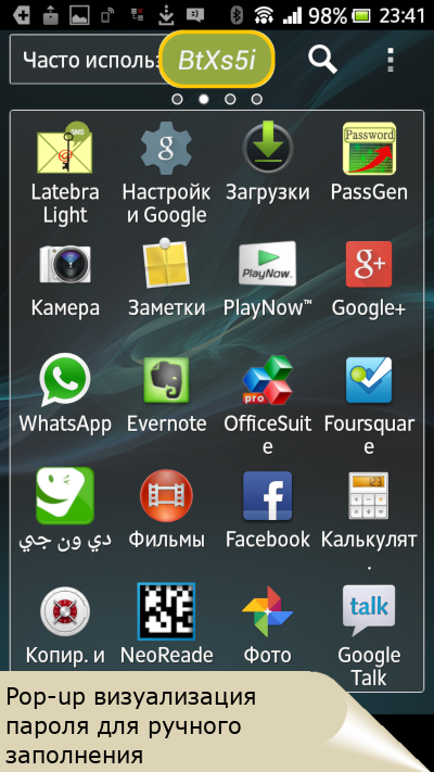 PassGen สร้างลำดับแบบสุ่มของตัวอักษรละตินที่ไม่ซ้ำกันทั้งตัวพิมพ์เล็กและตัวพิมพ์ใหญ่ตัวเลขและสัญลักษณ์จากคำหรือวลีง่ายๆที่ง่ายต่อการจดจำและช่วยแก้ปัญหานี้ คุณเพียงแค่ต้องจดจำคำหรือวลีนี้และ PassGen สร้างรหัสผ่านให้คุณตามข้อกำหนดที่ทันสมัยทั้งหมด รหัสผ่านที่สร้างขึ้นสามารถแทรกได้ง่ายในบริการที่จำเป็นโดยใช้ขั้นตอนการคัดลอกวาง