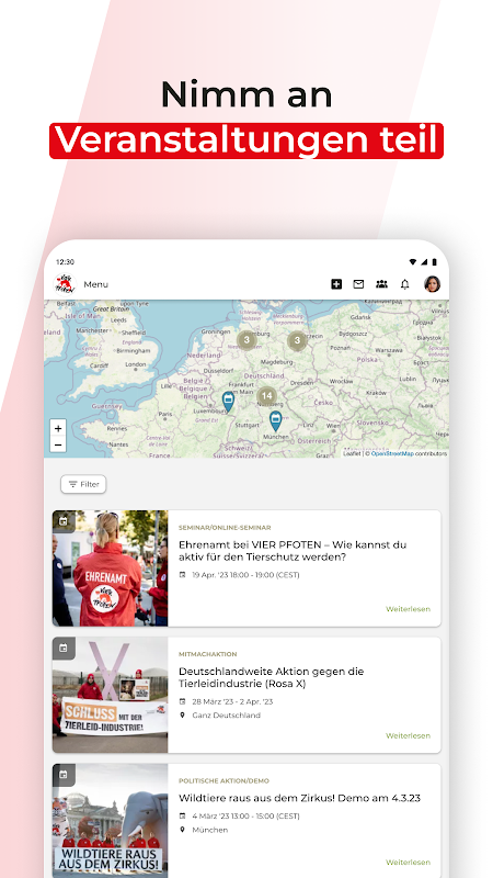คุณต้องการที่จะมีส่วนร่วมในกิจกรรม FOUR PAWS สร้างเครือข่ายกับนักเคลื่อนไหวเพื่อสิทธิสัตว์คนอื่นๆ รู้เกี่ยวกับวันที่กำลังจะมาถึงอยู่เสมอ หรือแม้กระทั่งทำตัวกระตือรือร้นด้วยตัวคุณเองหรือไม่?