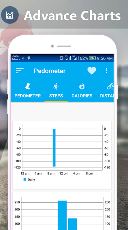 * Beautiful and advanced graphs for distance, time and calories burned, in 3 different intervals (day, week and month)