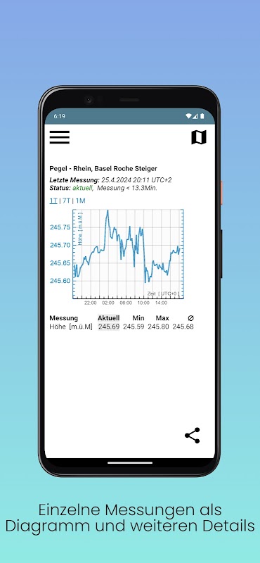ผ่านการแจ้งเตือนแบบพุช แอปจะเปิดใช้งานคำเตือนเกี่ยวกับระดับคำเตือนน้ำท่วมในด้านหนึ่งและระดับน้ำที่สูงสำหรับการนำทางในแม่น้ำไรน์ในอีกด้านหนึ่ง