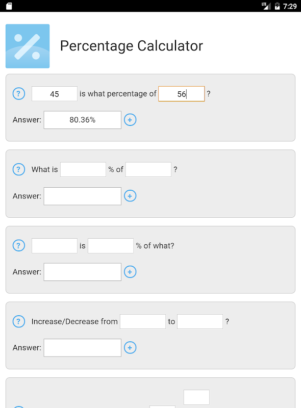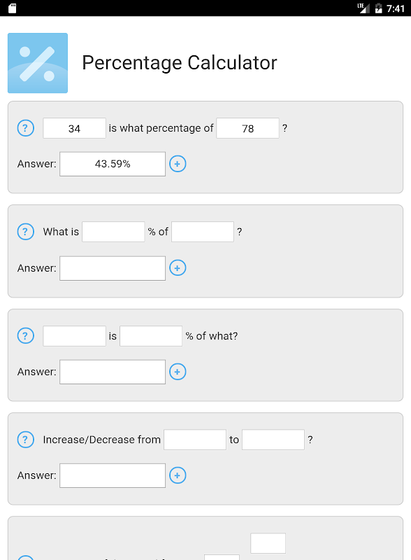 คำนวณเปอร์เซ็นต์รุ่น Android ของโปรแกรมประยุกต์บนเว็บที่นิยมมาก https://percentagecalculator.mes.fm ทำโดยคณิตศาสตร์โซลูชั่นง่าย