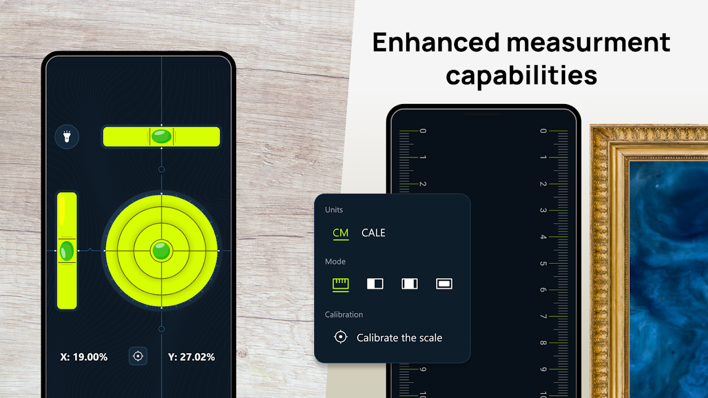ในโหมดระดับเลเซอร์ที่ใช้งานสะดวกซึ่งใช้หน้าจอกล้อง คุณสามารถทดสอบระดับและมุมของโครงสร้างอาคารของคุณ (โดยใช้ไม้โปรแทรกเตอร์) และดาวน์โหลดค่าที่อ่านได้ไปยังแผ่นจดบันทึกหรือแกลเลอรีโทรศัพท์