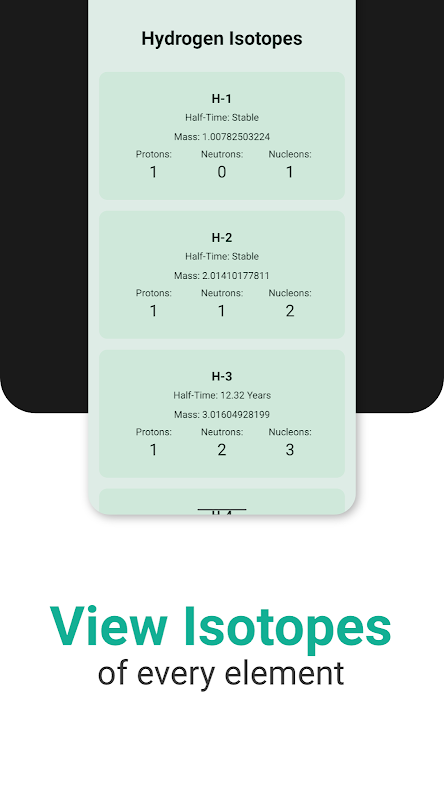 'Atomic – Periodic Table' เป็นแอปโอเพ่นซอร์สที่ได้รับการออกแบบให้ใช้งานง่าย ซึ่งหมายความว่าแอปนี้เหมาะสำหรับทั้งผู้ที่ต้องการข้อมูลเคมีและฟิสิกส์พื้นฐาน เช่น น้ำหนักอะตอมของธาตุ ไปจนถึงผู้ใช้ขั้นสูงที่อาจต้องการข้อมูลที่ละเอียดกว่า เช่น ค่าเฉลี่ยครึ่งหนึ่งของไอโซโทปของไอโซโทปมากกว่า 2,500 ตัว หรือพลังงานไอออไนเซชันของธาตุ แอปนี้มีตารางต่างๆ ให้เลือกหลายตาราง รวมทั้งมีตัวเลือกอื่นๆ ที่จะช่วยให้แสดงภาพข้อมูลได้อย่างง่ายดาย และจะมีตัวเลือกอื่นๆ เพิ่มเติมในอนาคตอันใกล้นี้ 'ตารางธาตุอะตอม' เป็นประสบการณ์ที่ไม่ยุ่งยาก ไม่มีโฆษณาหรือสิ่งไร้สาระอื่นๆ เพียงแค่มีข้อมูลทั้งหมดที่คุณต้องการสำหรับโปรเจ็กต์เคมีหรือฟิสิกส์ของคุณ!