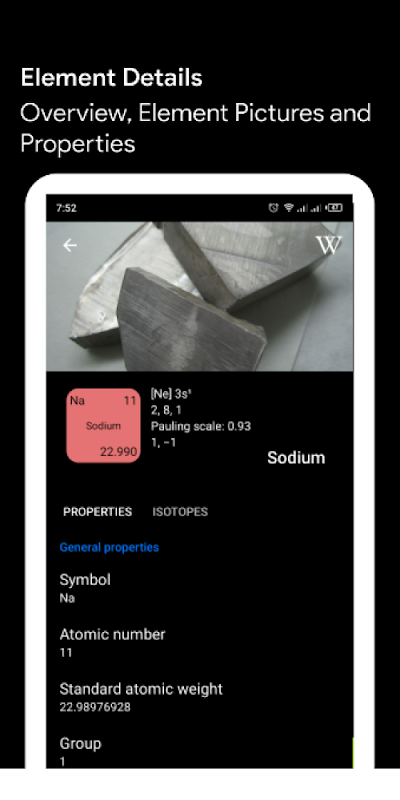 นอกจากชื่อและสัญลักษณ์ขององค์ประกอบทางเคมีแล้วแอปพลิเคชั่นนี้ยังมีรูปภาพในโลกแห่งความเป็นจริงทั้งหมดขององค์ประกอบทางเคมีและแผนผังของการกำหนดค่าเปลือกอิเล็กตรอน