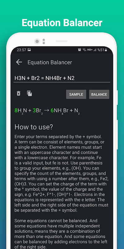 คุณสามารถสร้างสมดุลของสมการทางเคมีของคุณด้วยเครื่องชั่งสมการทางเคมี เพียงแค่ใส่สมการและรับค่าสัมประสิทธิ์ของมัน