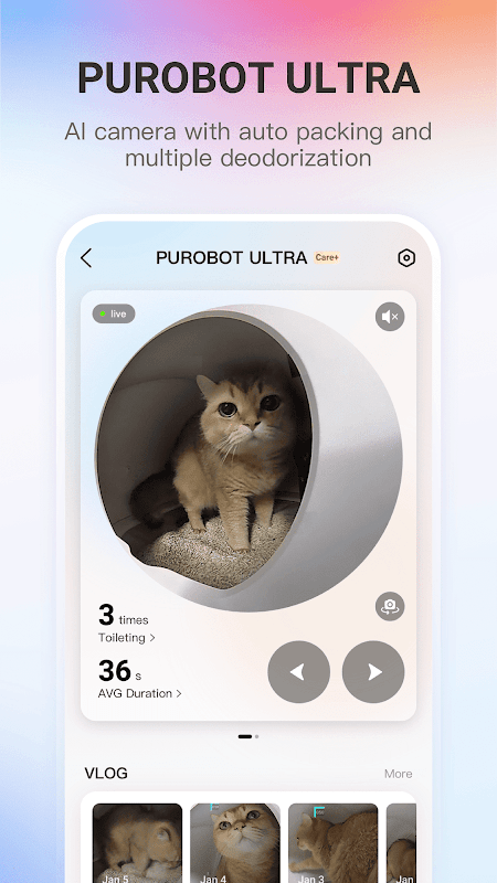 - การบันทึกวิดีโอและภาพตามเหตุการณ์: บันทึกกิจกรรมในกระบะทรายโดยอัตโนมัติ ดูคลิปสดหรือดูคลิปย้อนหลัง และแบ่งปันข้อมูลเชิงลึกกับสัตวแพทย์ของคุณเพื่อขอคำแนะนำที่ทันท่วงที
