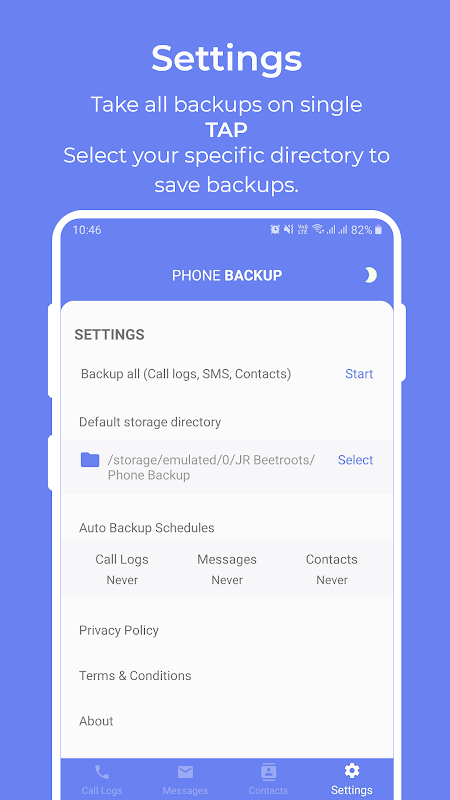 Phone Backup คือแอปพลิเคชันที่จะสำรองข้อมูลบันทึกการโทร ข้อความ และรายชื่อติดต่อของคุณทั้งหมดลงในพื้นที่เก็บข้อมูลภายในโทรศัพท์และพื้นที่เก็บข้อมูล Google Drive ของคุณ เพื่อสำรองและกู้คืนข้อมูลเมื่อใดก็ตามที่คุณต้องการกู้คืนข้อมูลให้กลับสู่สถานะเดิม