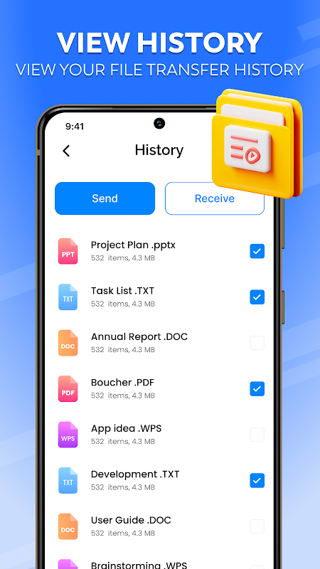 ไม่มีข้อจำกัดเกี่ยวกับขนาดไฟล์อีกต่อไป คุณสมบัติการถ่ายโอนไฟล์ขนาดใหญ่ของแอปของเราช่วยให้คุณแบ่งปันได้อย่างง่ายดายแม้แต่วิดีโอหรือเอกสารที่ใหญ่ที่สุด แอปถ่ายโอนไฟล์กลายเป็นคู่หูที่เชื่อถือได้ของคุณเพื่อการแชร์อย่างรวดเร็วด้วยแอปแชร์ไฟล์ที่มีประสิทธิภาพ ช่วยให้คุณสามารถถ่ายโอนไฟล์และส่งไฟล์ขนาดใหญ่ได้โดยไม่ติดขัด