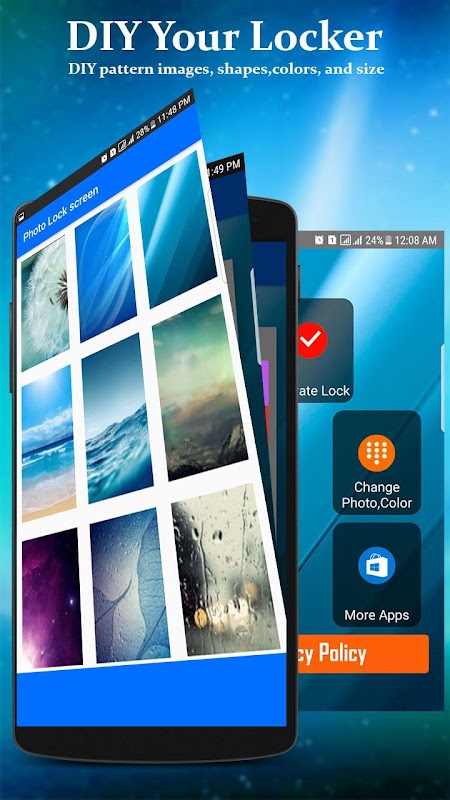 : Hi, this is our new lock screen application. Photo Pattern Lock Screen is one the best new lock screen with photo. This lock screen is very useful. We are developed this superb romantic lock screen for all lovers, friends or family! With Photo Pattern Lock Screen, you can set pattern password to increase security of your smartphone. With simple and awesome function, we allow you to totally customize your very own Photo Pattern Lock Screen. It was designed to protect your phone with high security. You can do many things to have your own Photo Pattern Lock Screen: set background for lock screen from wallpapers in application or from your collection, set photos on buttons (for example: your lover, your wife, your husband, your flowers, your pets.), you can easy to set color and size of date/time; you also can add your names or idiom on screen, and you can change size and color of that sentences.