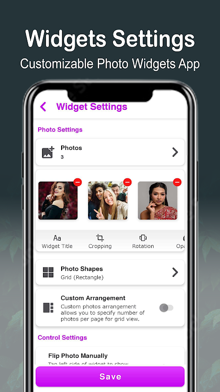 การหมุน: ผู้ใช้สามารถหมุนวิดเจ็ตภาพถ่ายบนหน้าจอหลัก Android ได้ที่ 90, 180 และ 270 องศา
