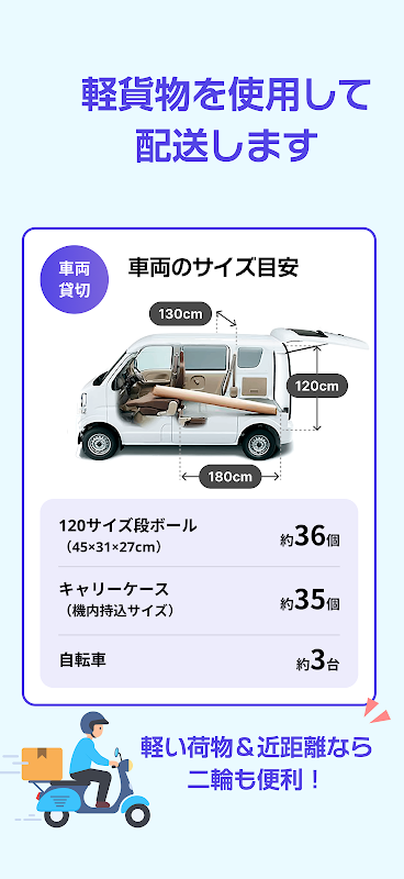 อันดับ 1 ในด้านจำนวนพันธมิตรการจัดส่ง* คุณสามารถค้นหาบริการจัดส่งได้ภายในเวลาเพียง 1 นาที คุณจึงสามารถส่งสัมภาระได้ทันที (*) จากการวิจัยของเราเอง จำกัดเฉพาะยานพาหนะขนส่งสินค้าขนาดเล็ก