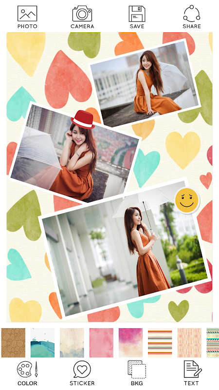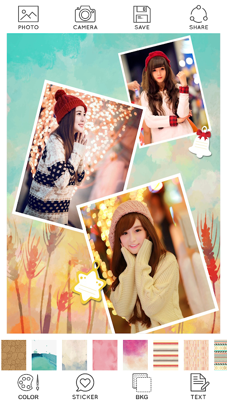 Easy collage photos with art background, text and typographic sticker. Picture Collage: Quick combine your photo become art photo with art background, beauty font and awesome typography sticker. You have more than 40 nice background to create art collage. Addition, you can choose background from your gallery with blur effect or chose color background. With photo, you can choose photo from your gallery or take new photo.