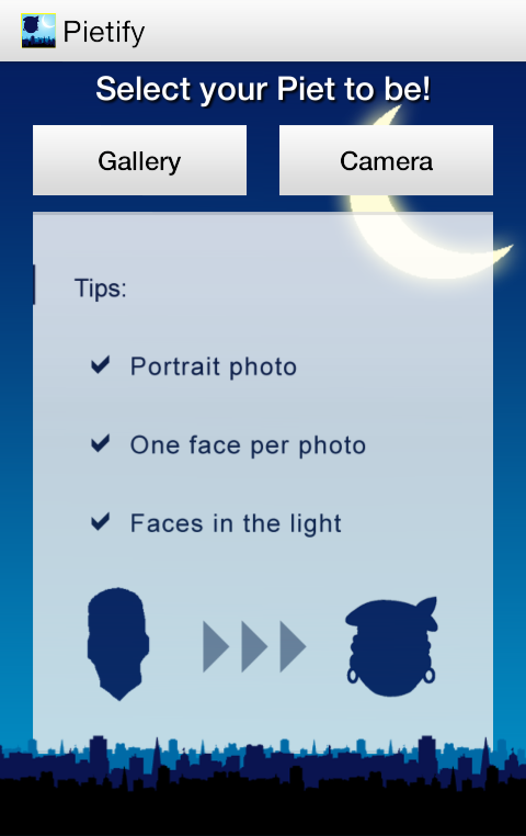 Turn any face on a photo into the infamous 'Zwarte Piet' from the national dutch tradition of the Saint Nicolaas. Saint Nicolaas aka Sinterklaas was a holy man who brought the kind children gifts at the beginning of december. Sinterklaas is being supported by many 'Zwarte Pieten' to help him distribute all the presents.