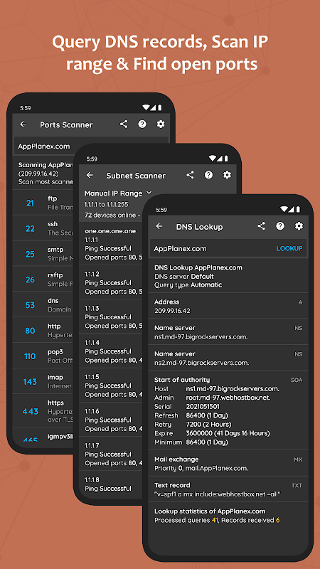 ขอแนะนำชุดเครื่องมือเครือข่ายและยูทิลิตี้อันทรงพลังที่ออกแบบมาเพื่อช่วยคุณวิเคราะห์ ทดสอบ และวินิจฉัยปัญหาที่เกี่ยวข้องกับเครือข่ายได้อย่างง่ายดาย แอปนี้มีชุดเครื่องมือเครือข่ายที่ครอบคลุม ทำให้แอปนี้เป็นผู้จัดการเครือข่ายที่จำเป็นสำหรับผู้เชี่ยวชาญด้านไอที ผู้ดูแลระบบเครือข่าย และผู้เชี่ยวชาญด้านเทคโนโลยี ไม่ว่าคุณจะต้องแก้ไขปัญหาการเชื่อมต่อ ตรวจสอบประสิทธิภาพเครือข่าย หรือทำการวินิจฉัยเครือข่ายขั้นสูง แอปนี้มีเครื่องมือที่เหมาะสมสำหรับงาน ควบคุมเครือข่ายของคุณได้ทุกที่ทุกเวลาด้วยชุดเครื่องมืออรรถประโยชน์เครือข่ายแบบออลอินวัน