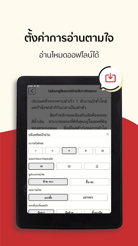 • ตั้งค่าการอ่านดั่งตาฝัน ปรับความสว่าง ขนาดตัวอักษร สีพื้นหลัง ปัดซ้าย-ขวา บน-ล่าง ตามใจถนัด