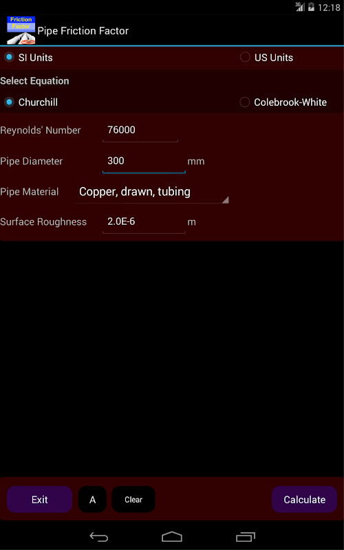 แอพยอมรับอินพุตในสองหน่วยที่แตกต่างกันคือ SI Units และ US Units มีฐานข้อมูลขนาดเล็กสำหรับวัสดุท่อต่างๆ ที่รวมค่าความหยาบของพื้นผิวที่นำมาจากวรรณกรรม