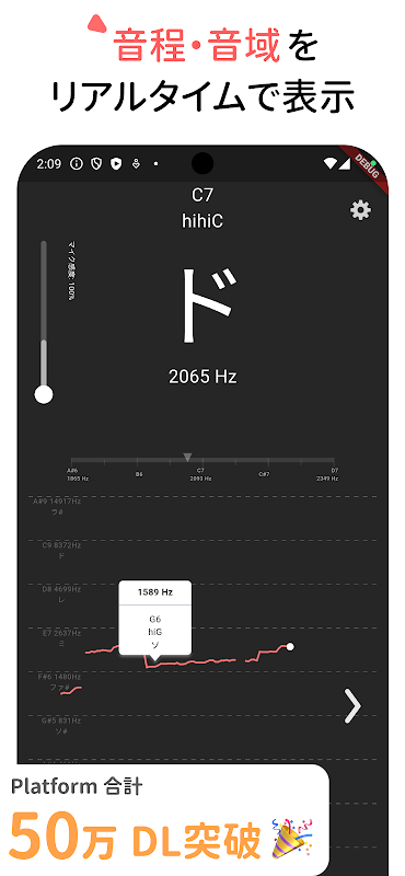 คุณสามารถหยุดการวิเคราะห์ได้ด้วยการแตะเพียงครั้งเดียว เพื่อให้คุณตรวจสอบผลลัพธ์ได้ตามจังหวะของคุณเอง จอแสดงผลยังรองรับโน้ตเสียงต่างๆ เช่น เสียงต่ำ, เสียงกลาง 2 เสียง, เสียงสูงต่ำ A เป็นต้น