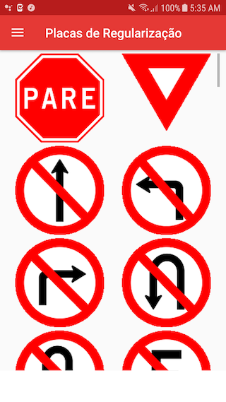 No APP você encontra as Placas de Sinalização de Regulamentação e as de Sinalização de Advertência.